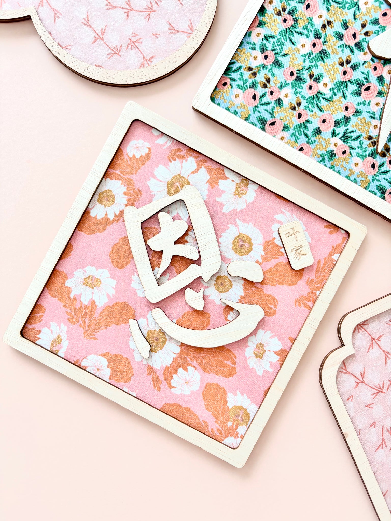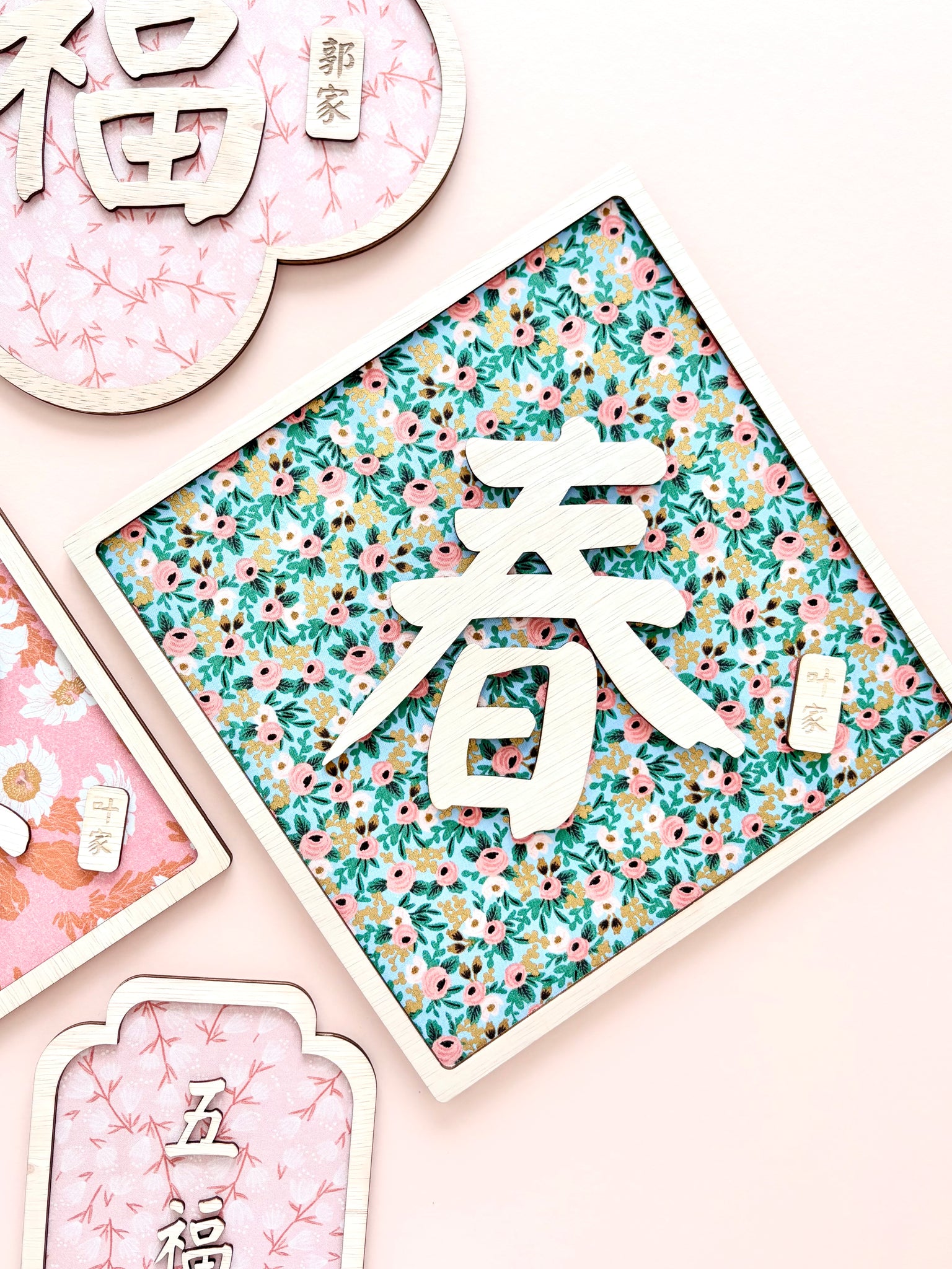 Each piece features a Chinese character layered over a floral fabric background and finished with a natural wood frame. You may also choose to personalize with your family surname, creating a truly personal keepsake for the new year.
